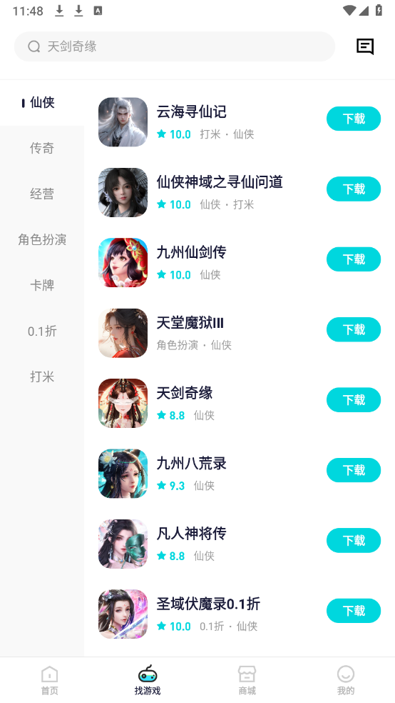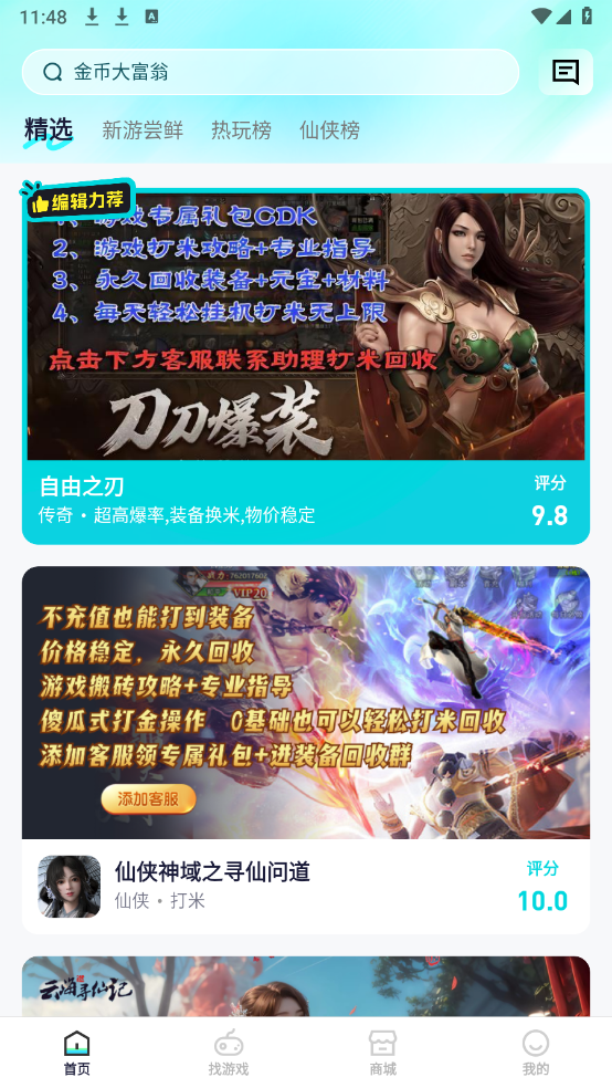 首页和找游戏页面都汇聚了海量游戏资源,仙侠、三国、传奇等各类游戏应有尽有。