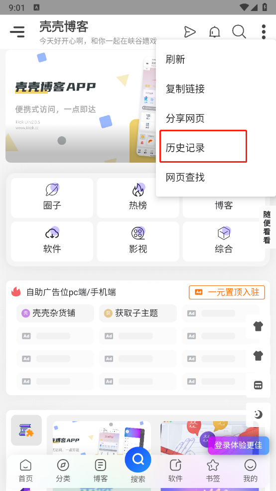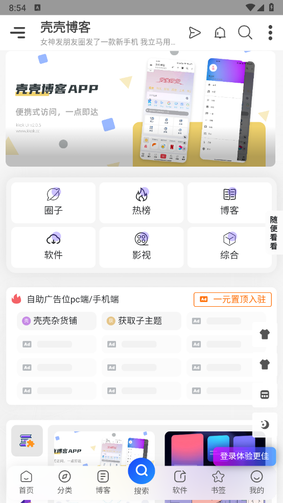 进入首页后,能看到详细的资源分类,其中包含软件库、社交圈子,还有影视、博客等类别。