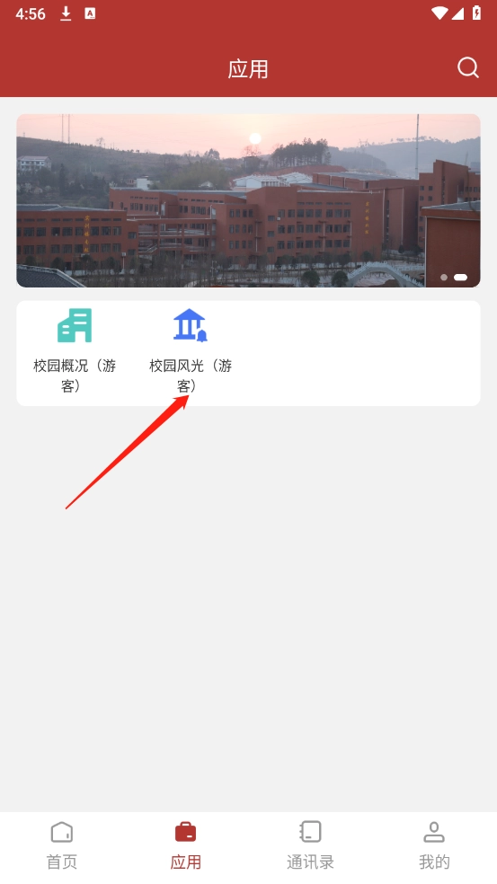 游客进入后可使用的功能比较有限,主要包含招聘信息、校园风光以及学校概况等几个板块。