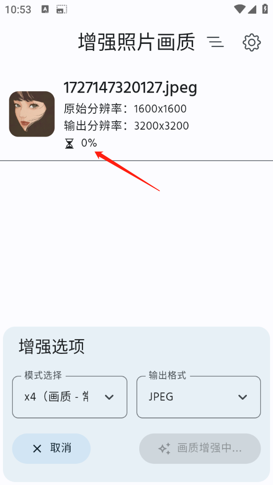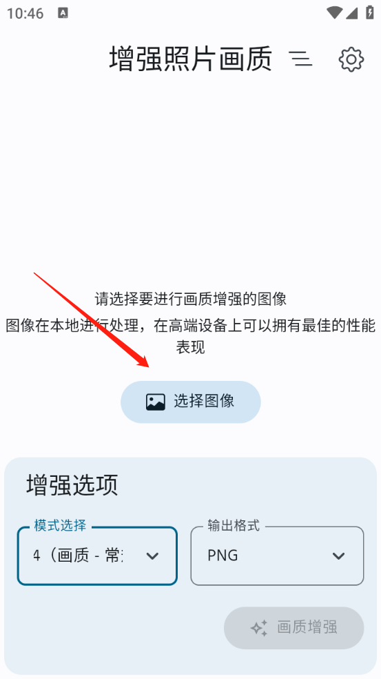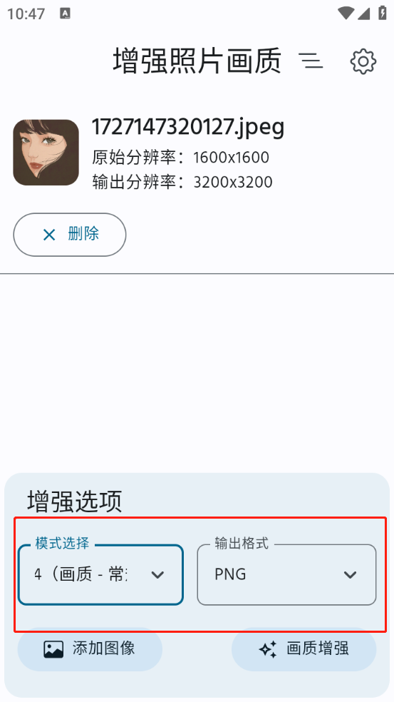 挑选完照片后,选定画质模式与图片输出格式,再点击“增强画质”按钮。