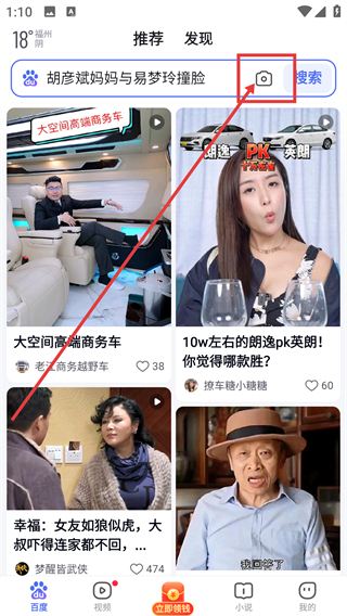 1、在百度首页,点击搜索框右侧的相机图标,即可进入拍照搜索相关功能界面,准备进行识图操作啦。