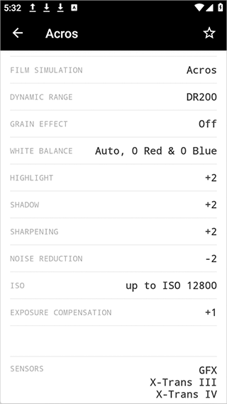 应用界面会呈现出该配方要求的全部具体设置,像胶片模拟、白平衡、动态范围、高光、阴影和颗粒效果之类。