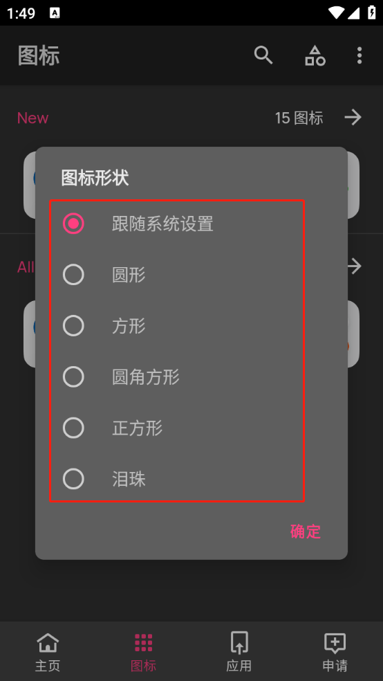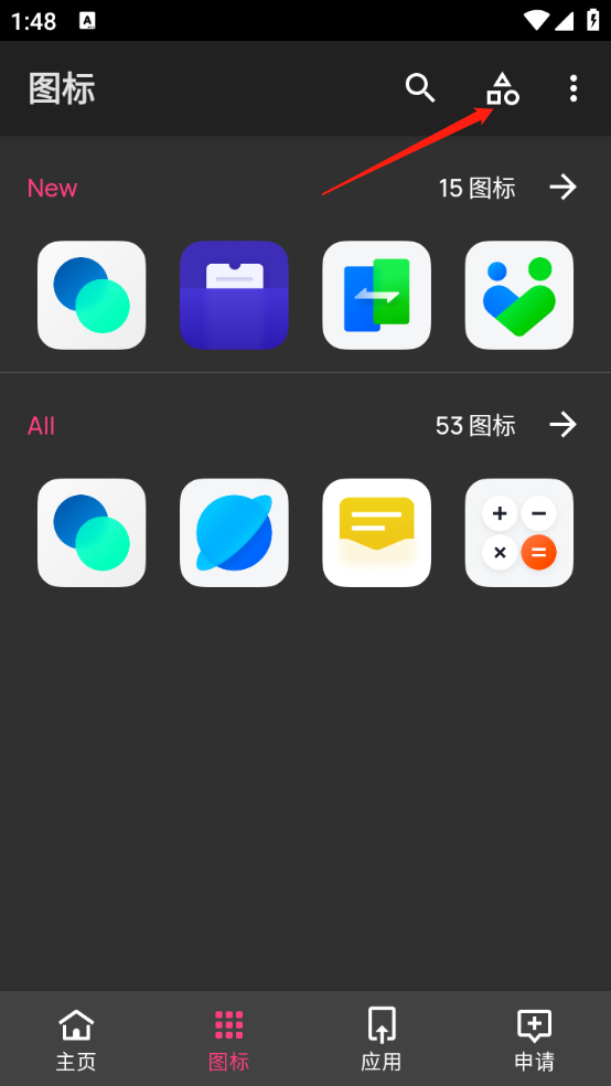 根据应用程序的导航类型,你可以通过从左侧滑出导航抽屉进入“应用图标”页面,或者点击底部导航栏的第4个图标。在该页面中,你能选择一个启动器来应用图标包。部分启动器不支持自动应用图标包,所以需要在这类启动器的设置里手动进行应用操作。
