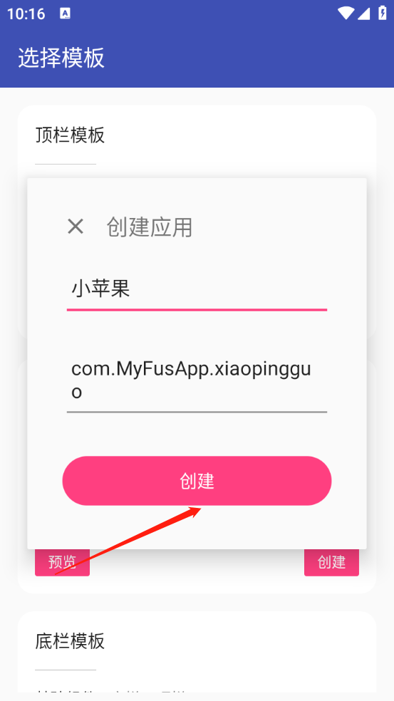 在新打开的页面里点击“创建”按钮,输入拟创建的应用名称与应用包名,随后再次点击“创建”按钮。
