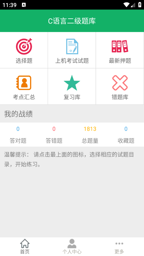 首页设有多种题库类型,涵盖选择题、上机考试题库、复习库等板块,可根据自身需求点击选择。
