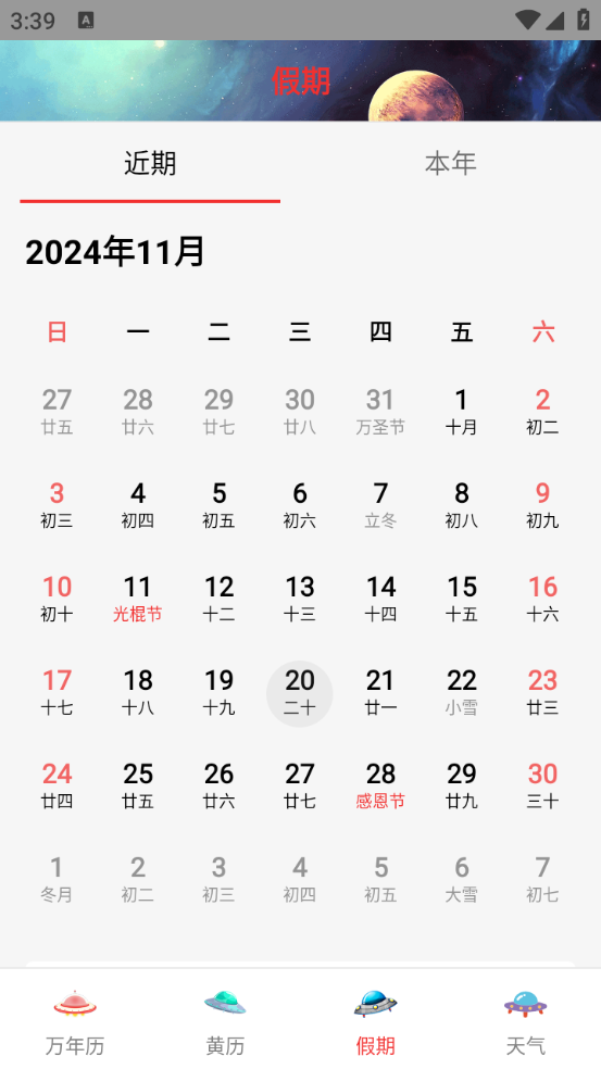 进入首页后,首页的万年历页面会为用户呈现详细的日历信息。