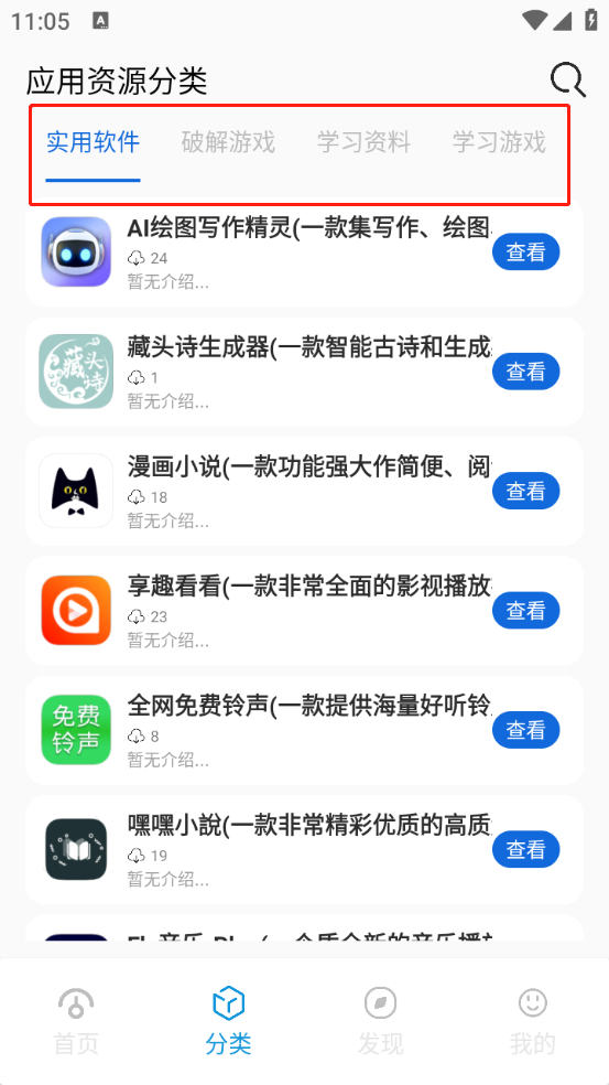 “分类”板块支持按类型查找软件,涵盖学习资料、影视、游戏类等类别。