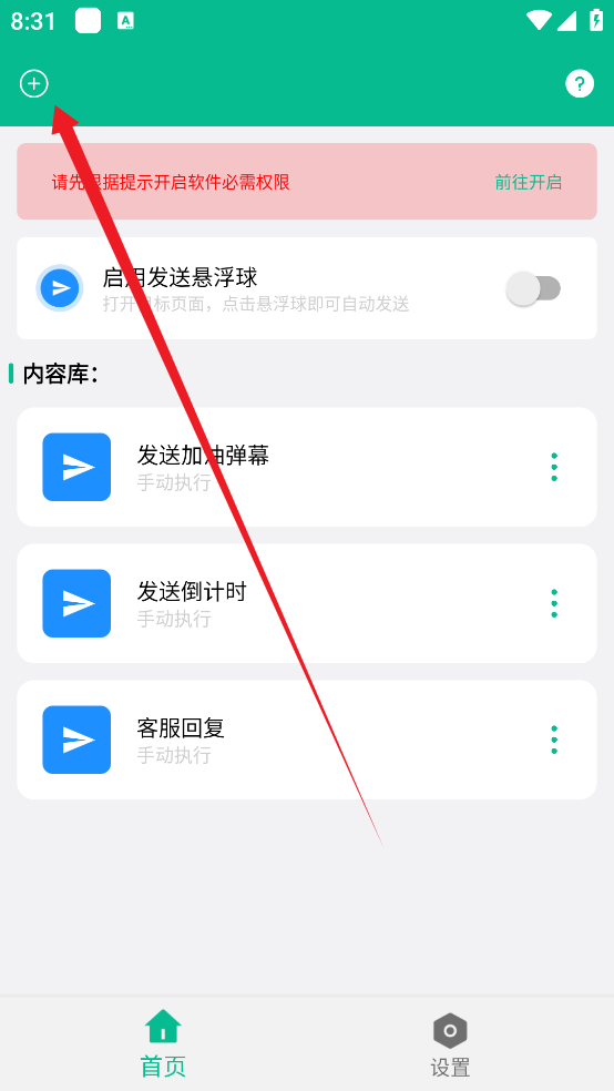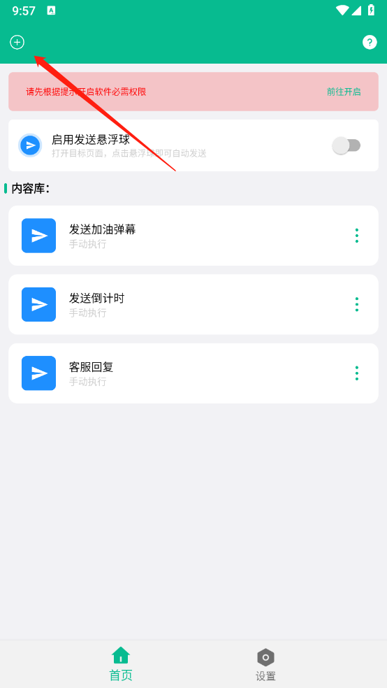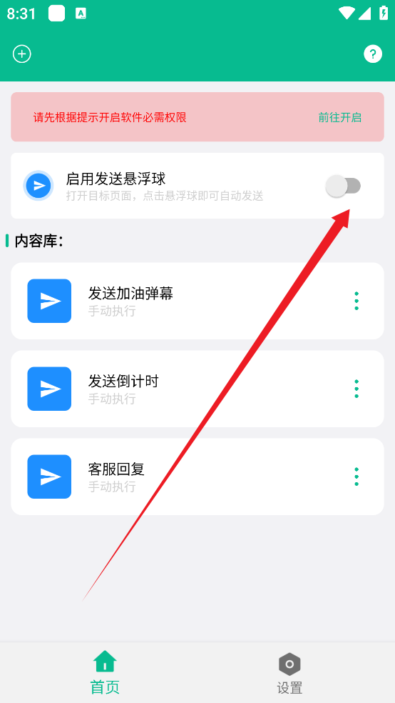 点击首页【启用发送悬浮球】开关,开启悬浮球功能。