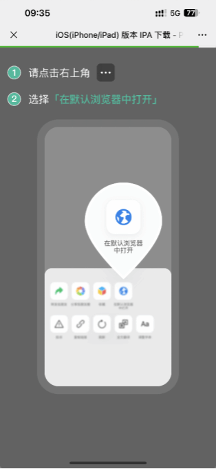 要是您是在微信、钉钉、支付宝这类应用里打开安装页面的话,这些应用自带的浏览器没办法直接完成安装操作。请您依照下面的步骤在Safari浏览器中打开安装页面: