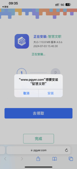 在 Safari 浏览器打开的安装页面里,您能看到应用的详细信息以及一个“安装”按钮。点击该“安装”按钮后,系统会弹出安装确认的提示框,此时再次点击“安装”即可。