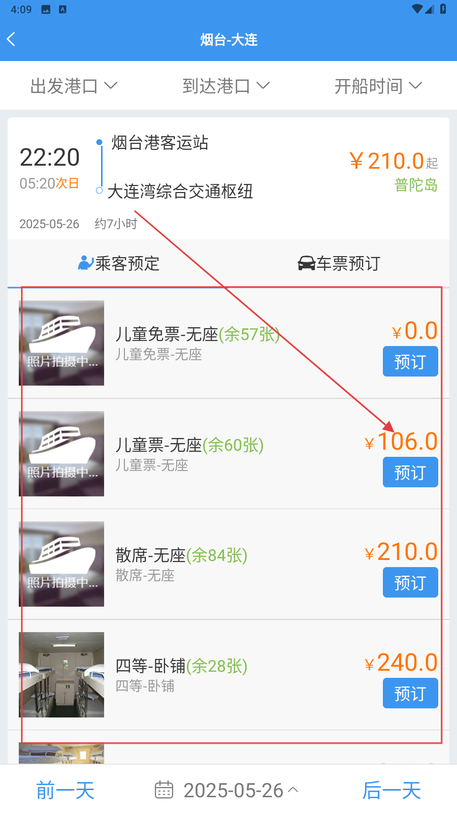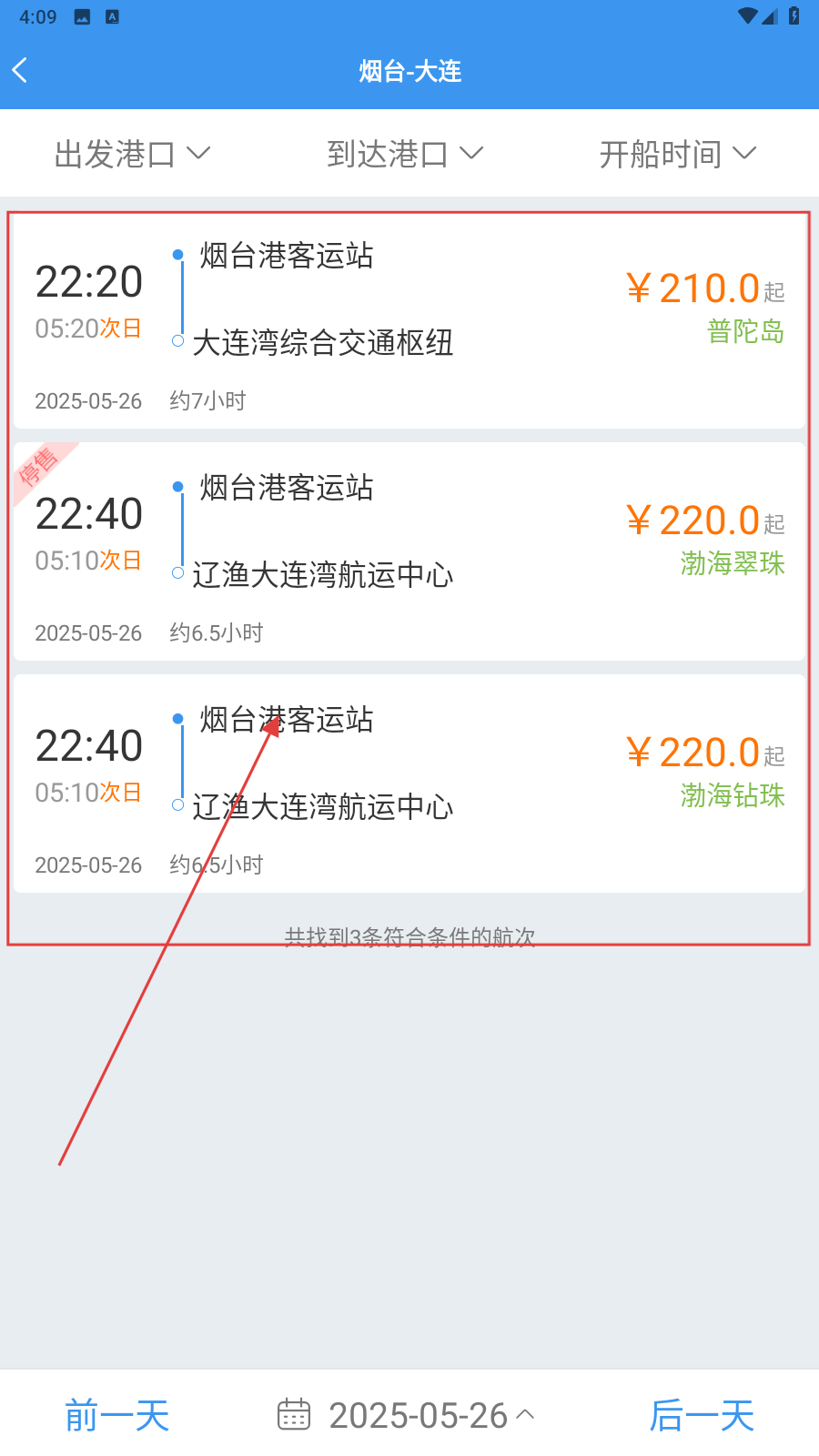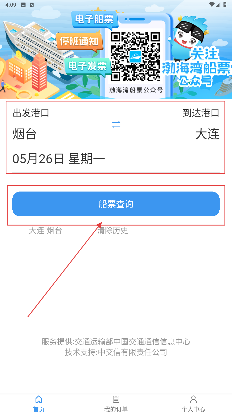是一款专注于渤海湾水域水路客运服务的智能平台,依托网络化运营管理技术,构建了集船票查询、在线预订、订单管理于一体的全链路服务生态。该应用覆盖渤海湾全部航线,支持实时票价查询与动态更新,整合微信支付、支付宝、银联等多种支付方式与电子发票服务,日均处理订单超5000单。通过技术创新与流程优化,为用户提供便捷、高效、安全的船票订购体验,助力渤海湾水路客运行业数字化升级,推动智慧交通建设。1、打开应用,选择港口和日期后点击【船票查询】。