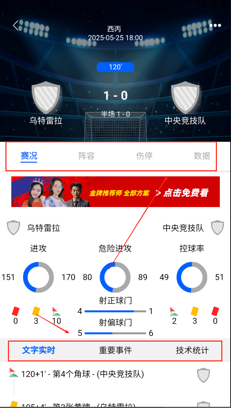 2、进入数据统计版块,查看实时更新的球队控球率、射门次数等18项核心参数。