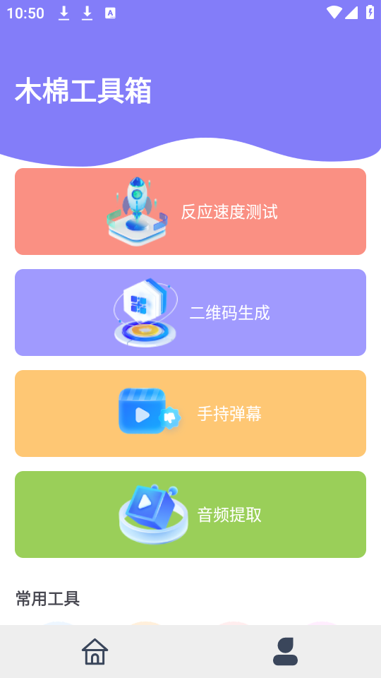 首页包含多种实用工具,像二维码生成、反应速度测试和手持弹幕等功能都在其中。