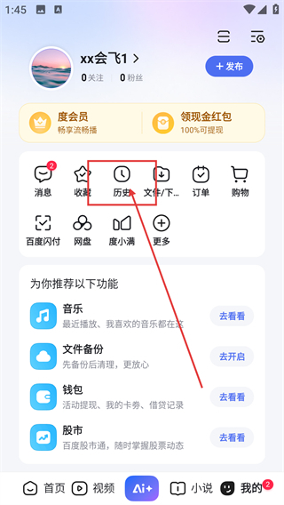 2、进入个人中心后,点【历史】选项能查看浏览记录,这里会展示之前访问过的内容条目啦。