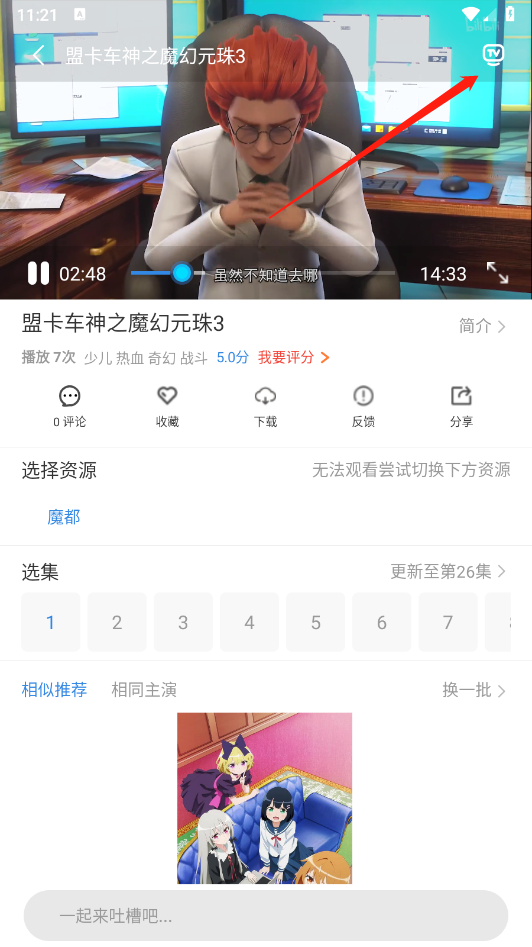 点开影视内容,点击右上角的“TV”标志。