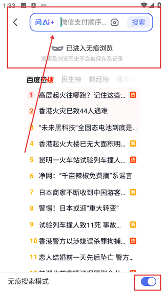 2、如果需要进入无痕浏览模式,在下方打开无痕浏览开关就可以开启了哦。