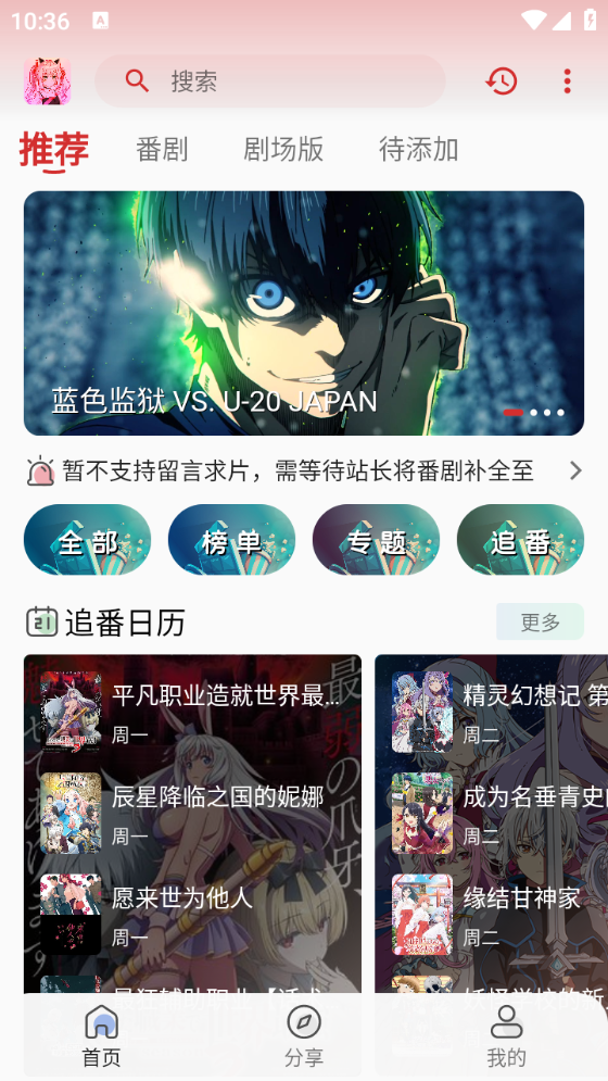 首页页面底部栏包含不少动漫分类,像推荐、番剧和剧场版之类的。