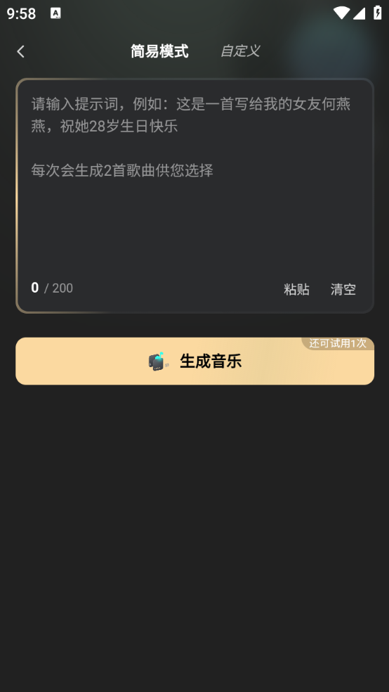 可以选择简易模式或自定义模式,在输入框中输入歌曲风格。