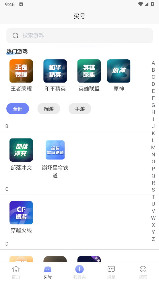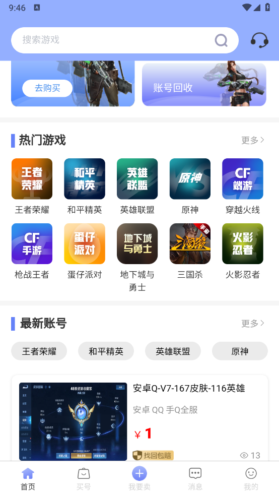 在首页以及以及买号板块提供了热门游戏账号的购买。
