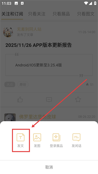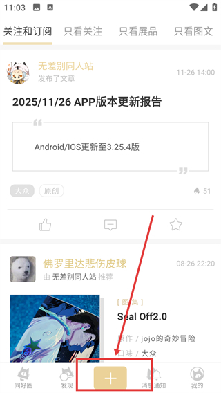 1、在关注和订阅页面点击底部的【+】按钮,就能展开内容发布的选项菜单,准备创作内容啦。