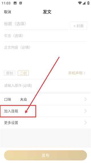 3、在发文编辑页找到【加入连载】选项并点击,就能打开连载选择的弹窗,设置内容的连载归属啦。