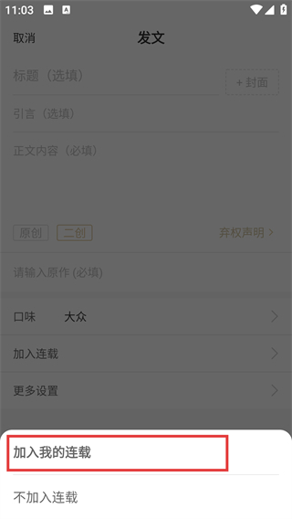 4、在连载弹窗中选择【加入我的连载】选项,就能将当前编辑的内容关联到自己的连载中啦。