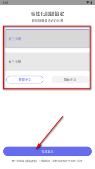 打开软件后,可先进行个性化阅读设置,其中涵盖男生小说、女生小说类别,以及简体和繁体中文语言选项。