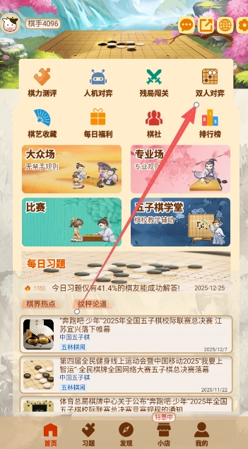 2、点击首页双人对弈界面,开始与好友玩家们之间的对局。