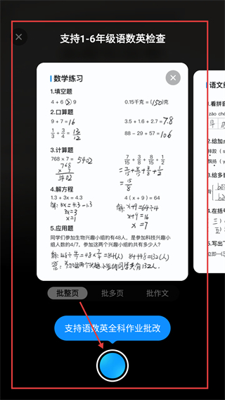 2、在作业批改页面,上传1-6年级语数英作业,点击对应按钮就能完成全科作业的批改哦。