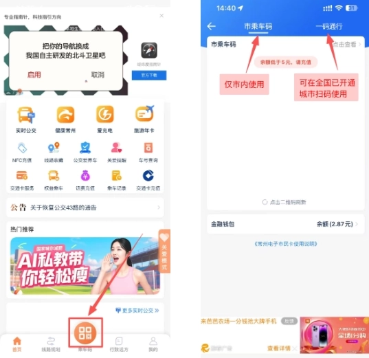1、并完成“常州行”安装与注册,点击首页底部“乘车码”;