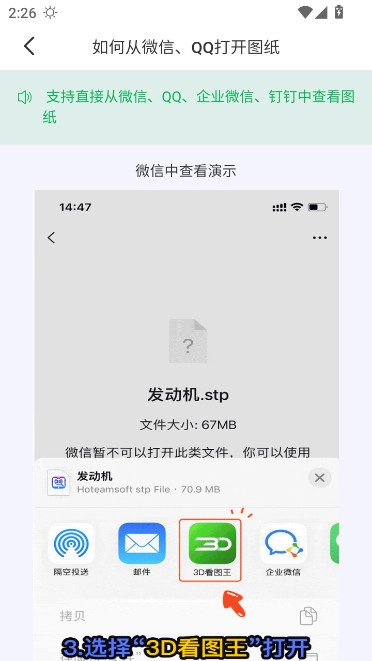 3D看图王支持直接从微信、QQ、企业微信、钉钉里查看图纸,手机端用户可按照下面的图示步骤进行操作,从而完成图纸打开的流程。
