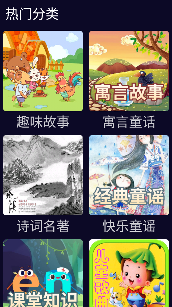 首页设有丰富的推荐内容,涵盖儿歌、绘本、童谣等类别,通过上下滑动就能轻松浏览。