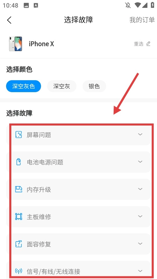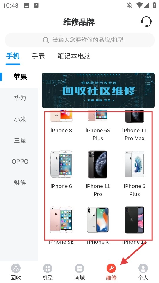 打开后,点击底部的【维修】选项,进入维修品牌的选择界面,接着挑选需要维修的设备。