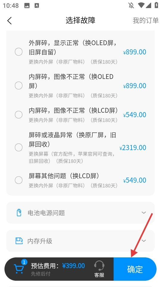 选择具体的故障情形,确认预估成本后,点击【确定】。