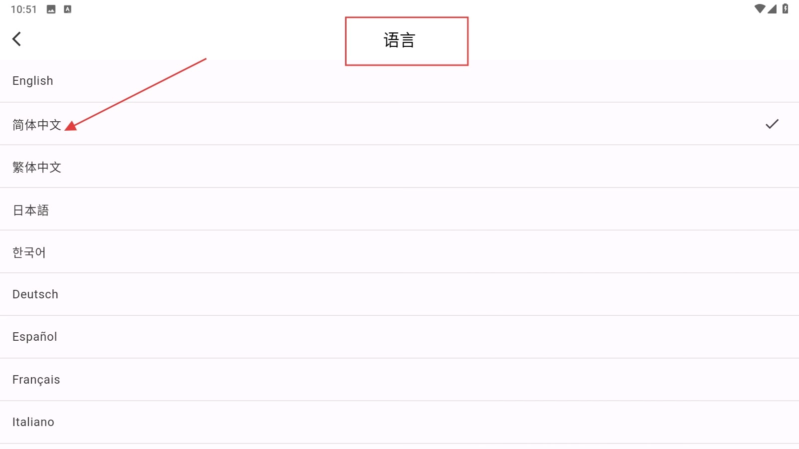 点击【语言】选项,可根据实际需求选择【简体中文】等语言。