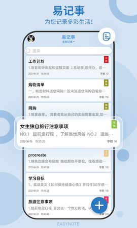 易记事配备了桌面插件功能,用户能把想每日查看的内容放置在桌面,如此每次点亮屏幕就能马上看到关键信息,既便捷又高效。考虑到用户的隐私安全,易记事还设有隐私锁功能。用户开启该功能后,可保障个人隐私不被外泄,使用起来更觉安心可靠。易记事是一款功能完备且操作简便的笔记备忘类应用。它除了拥有记事、笔记、备忘录等基础功能外,还提供网盘同步、简洁记事、个性主题、桌面插件以及隐私保护等实用功能。用户能够随时随地记录生活中的各类琐事,畅享便捷的使用感受。倘若您正在寻觅一款出色的笔记备忘应用,不妨尝试一下易记事,相信它会为您带来惊喜与便利。