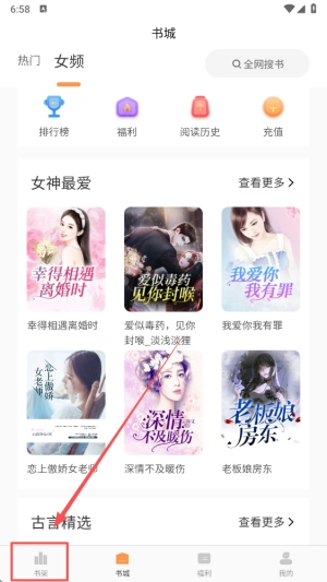 2、选择“书架”选项来查看您添加的所有小说和阅读列表。