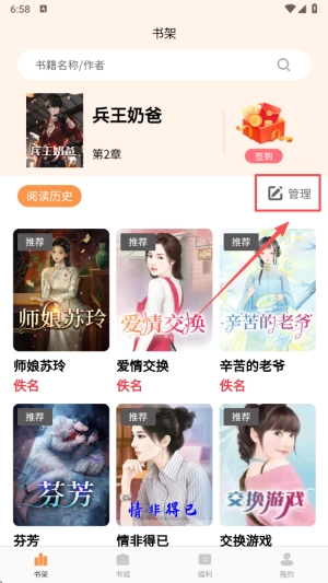 3、点击“管理”功能,进入图书管理界面,开始组织和删除图书。