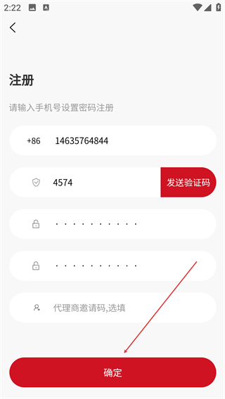 4、在注册页面,填写手机号、验证码、密码等信息,选填代理邀请码后,点击【确定】完成注册操作。
