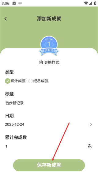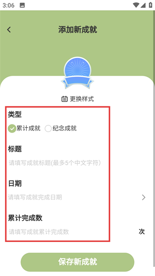 2、在【添加新成就】页,选择【累计成就】类型,填写5字内标题、完成日期与累计数,还可点击【更换样式】调整勋章外观。