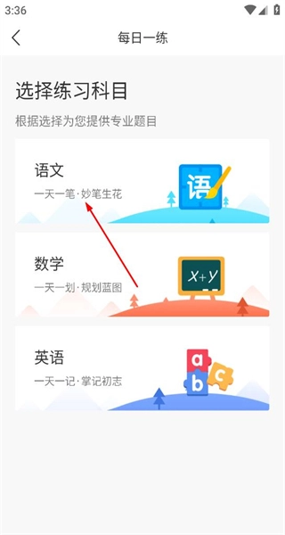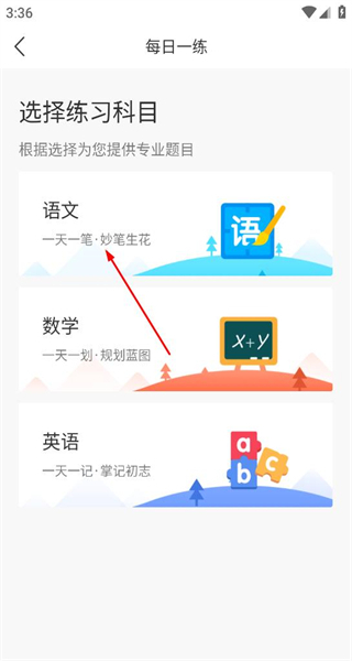 1、打开软件后,进入每日练页面看到科目选择项,选择语文科目,进入语文练习题目的页面。