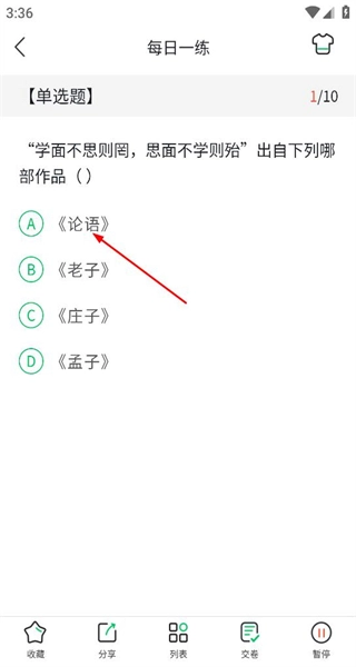 4、进入语文第三题页面,查看题目后选择选项A,完成该题作答,可继续进行后续题目的练习。