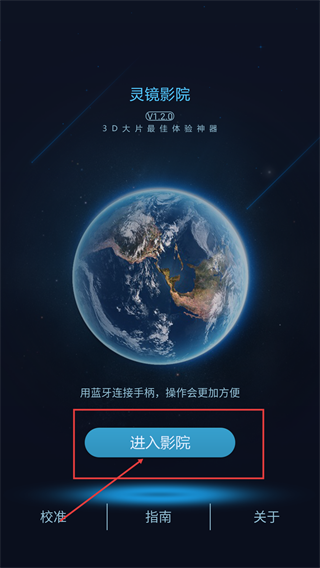 在【灵镜影院-V1.2.0】页面,您可以先通过蓝牙连接手柄来优化操作体验,之后点击【进入影院】按钮,即可体验3D大片的相关功能。