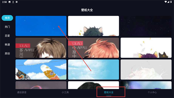 3、点击底部【壁纸大全】选项,进入壁纸分类页面,可浏览推荐、热门等类别的壁纸资源。