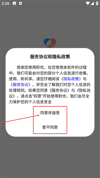 在使用聆忧之前,请务必仔细阅读《服务协议》和《隐私政策》,在充分了解个人信息的处理规则后,点击“同意并接受”按钮,即可继续使用本软件。