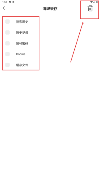 4、在【清理缓存】页面,勾选需清理的内容(如【搜索历史】【缓存文件】等),点击右上角删除按钮完成清理。