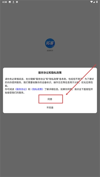 1、阅读【服务协议】与【隐私政策】条款后,点击【同意】按钮,即可进入【拓客帮手】的功能界面。