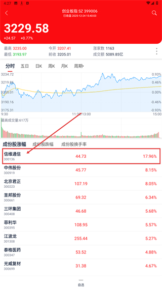 3、进入创业板指详情页后,查看其分时走势和成分股数据,点击【信维通信】这一条目,就能进入该个股的详情页面。