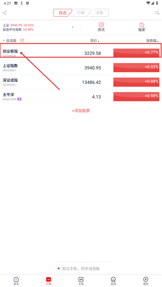 2、进入行情页面后,在自选列表中点击【创业板指】这类条目,就能进入该指数的详情页面,查看更详细的走势信息。