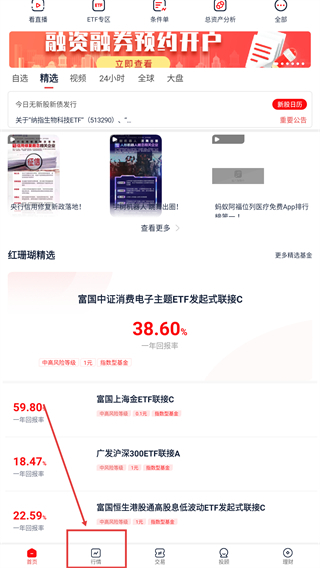 1、在首页点击底部的【行情】选项,即可切换到行情页面,查看各类市场指数和自选股的实时数据。